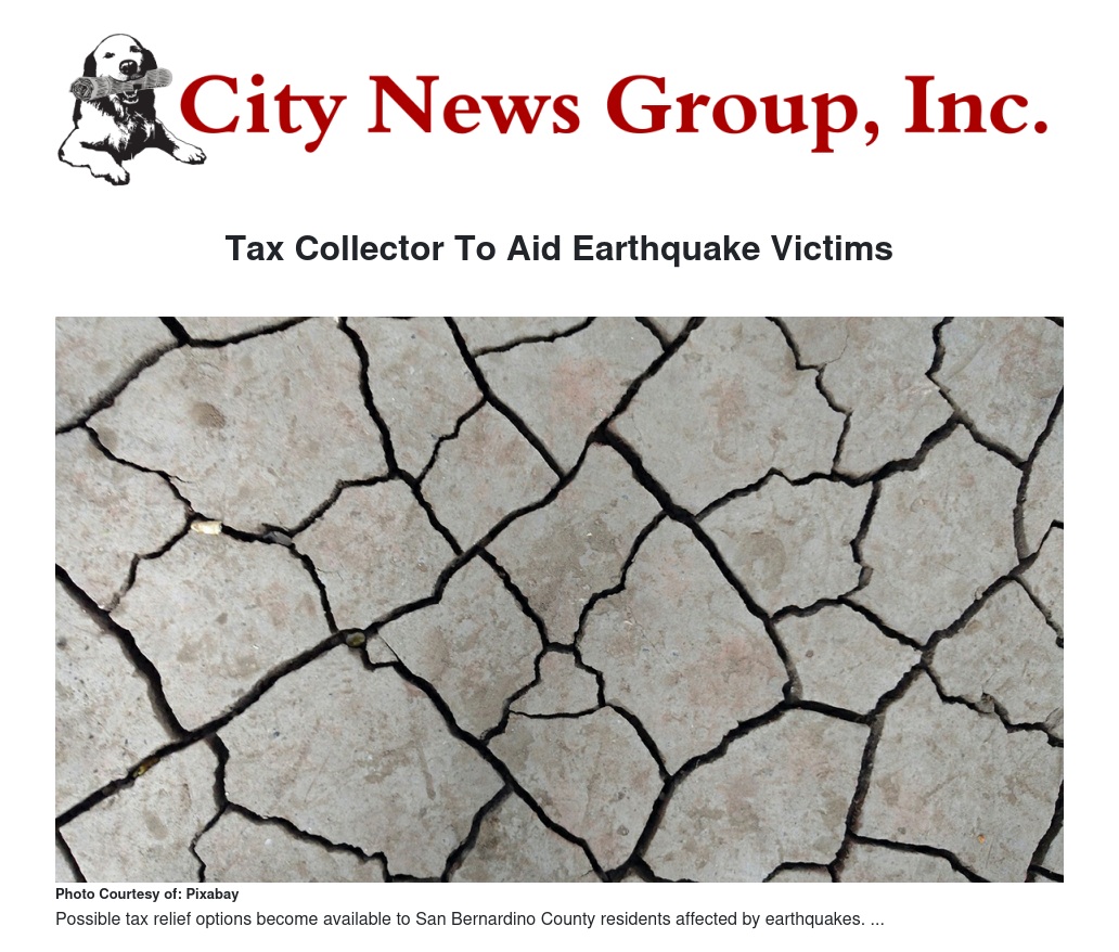 “I have directed my staff to prioritize taxpayer requests for earthquake property tax relief after they file requests with the Assessor and those requests are approved by his Office,” said Mason. “After contacting the Assessor, those affected by the natural disaster may contact our ATC office at (909) 387-8308 or toll free at 1 (877) 885-7654 for possible payment deferral.”