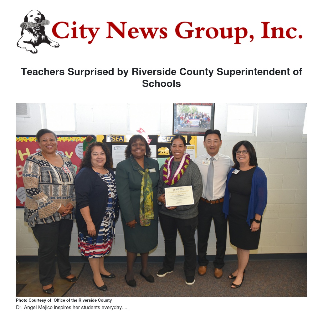 Riverside County Superintendent of Schools, Dr. Judy D. White, paid surprise visits to the final two 2019 Riverside County Teachers of the Year on Wednesday, May 30, who both teach in the Corona-Norco Unified School District.