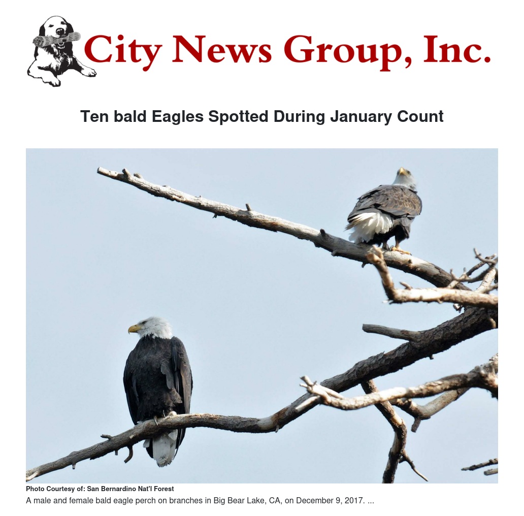 More than 140 people participated in today’s winter bald eagle count in and around San Bernardino National Forest, observing a total of ten bald eagles. The seasonal count, which takes place during the winter months, is now in its 39th year and is organized by the U.S. Forest Service with California State Parks.