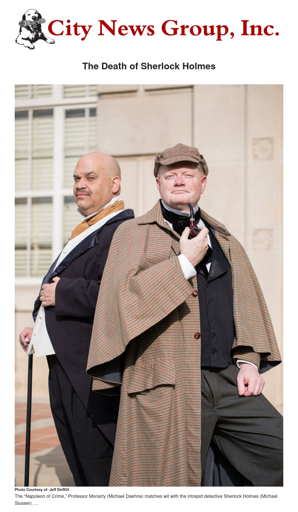 “The Death of Sherlock Holmes” features Michael Slusser as the famous detective with Wayne R. Scott as Dr. John H. Watson and Michael Daehne as Professor Moriarty. Also returning to their roles are Olin Richey, Sr. as Inspector Lestrade, Jennifer Keeney as Mrs. Hudson, and Philip Folkens as Stamford. Others featured in the production are Rich Durant, Olin Richey Jr., Charlie Orozco, Troy Miller, Kyle Ryan, Zac Swan Van Lent, Benji Dooley, Hailey Selters, Sally Angell, Katrina Cavarno, Elizabeth Keeney and Madeline Slusser.