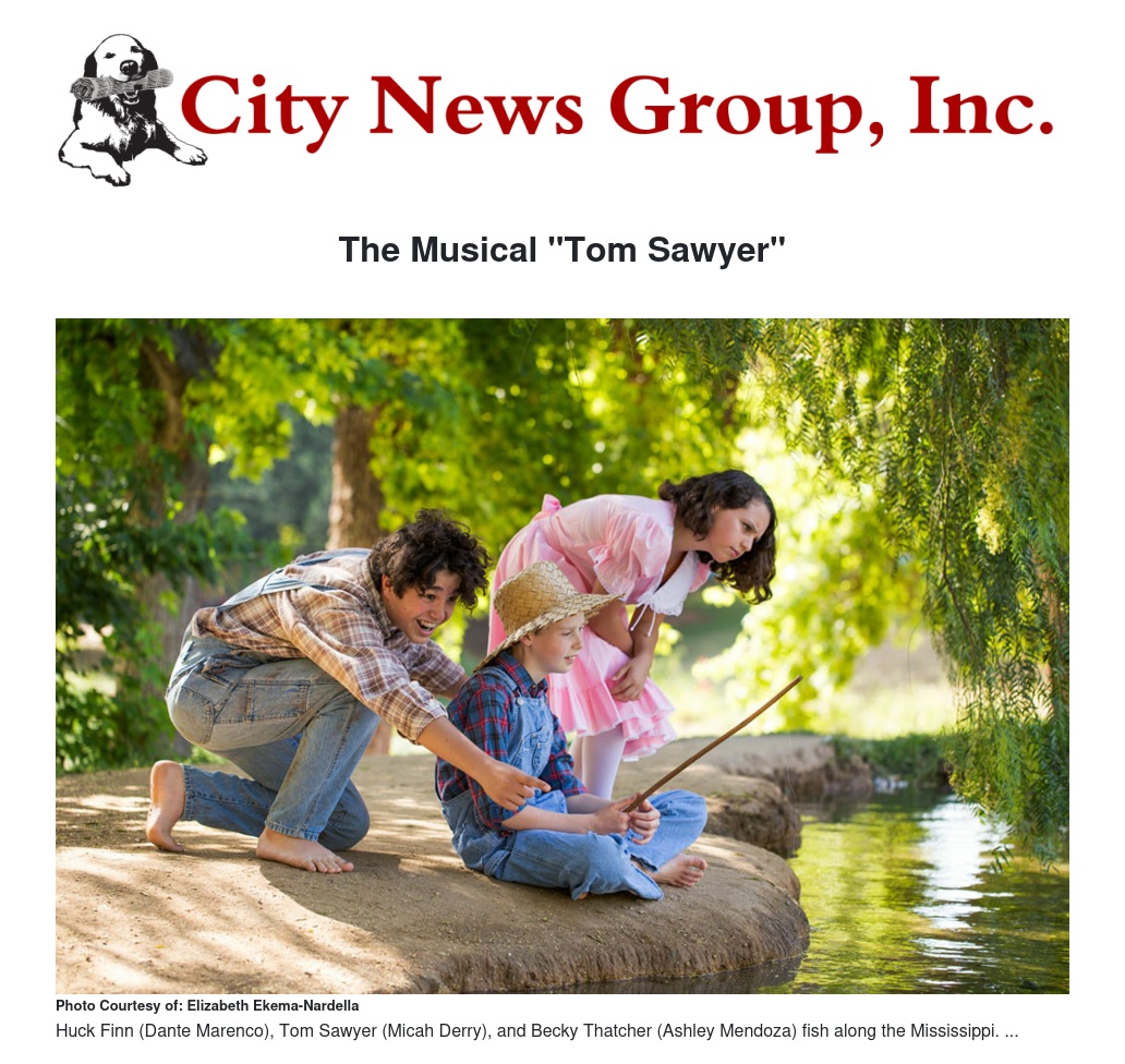 “Tom Sawyer” features Micah Derry in the title role.  The colorful cast of characters also includes Dante Marenco as Tom’s cohort Huck Finn, Daryon Robinson as Jim, Paul Zanone as the villainous Injun Joe, Michael Daehne as the befuddled Muff Potter, Ashley Mendoza as Tom’s crush Becky Thatcher, and Sarah Pearce as Aunt Polly.  Also featured are Lilly Spencer as Mary, Christian Groza as Sidney, Scott Dieninger as Judge Thatcher, Liam Blanck as Ben Rodgers, Zachary Michel as Jeff Thatcher, Karisa Harriman as Widow Douglas, Leilani Baldwin as Amy Lawrence, and Tom Williams as Mark Twain.