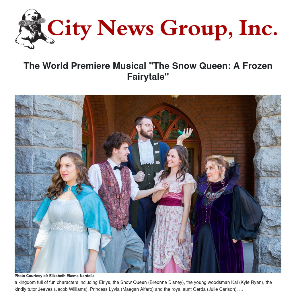 “The Snow Queen: A Frozen Fairytale” features Breonne Disney as Eirlys, the Snow Queen and Maegan Alfaro as her sister Lyvia. Also featured are Kyle Ryan as the woodsman Kai, Jacob Williams as the kindly tutor Jeeves, Julie Carlson as Gerda, John Griffith as the evil imp Abigrim, Jacob Michel as the vain Prince Hildebrand, Amanda Brinegar and John Solly as the King and Queen of Andor, and Oling Richey, Sr. as the wild Arteus the Astounding.