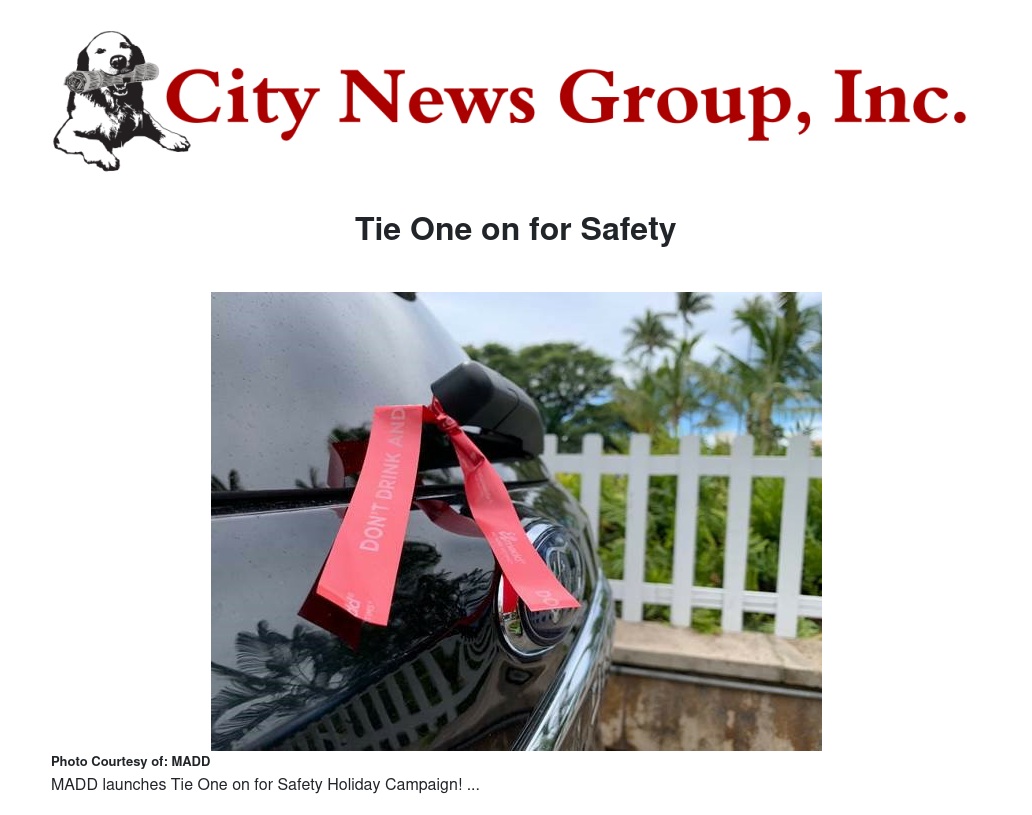 You can also use #MADDTieOneOnForSafety to share on social media. For more information on how you can support MADD and Tie One on for Safety Holiday Campaign, visit madd.org/the-solution/drunk-driving/tie-one-on-for-safety/.