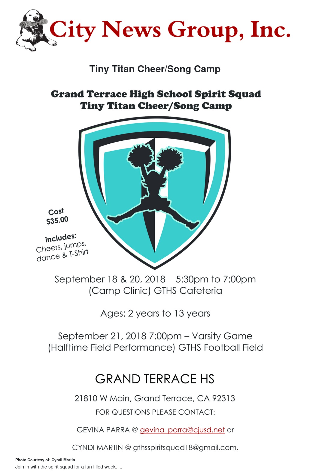 Do you have a young one who has always wanted to cheer or just has a passion for it? Well, thanks to the Grand Terrace High School Spirit Squad, they will finally have their chance. The squad is putting on their annual Tiny Titan Cheer and Song Camp for children ages 2 years old to 13 years old.