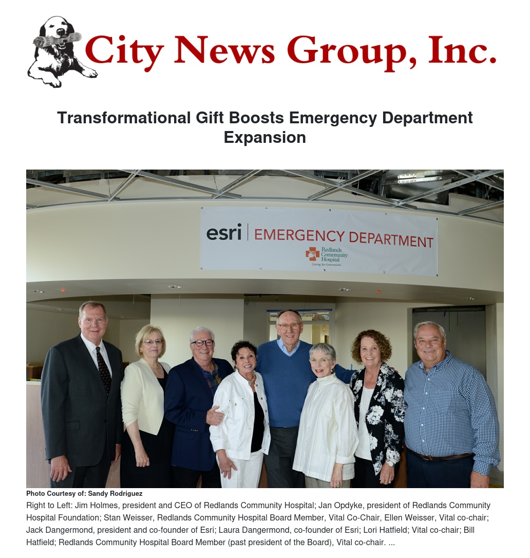 So it is with Esri, a Redlands-based global market leader in geographic information system (GIS) software. The company recently provided a substantial and transformational gift in support of Vital, Redlands Community Hospital’s Emergency Department expansion and renovation project. With that gift the long-awaited project moved considerably closer to becoming a reality.
