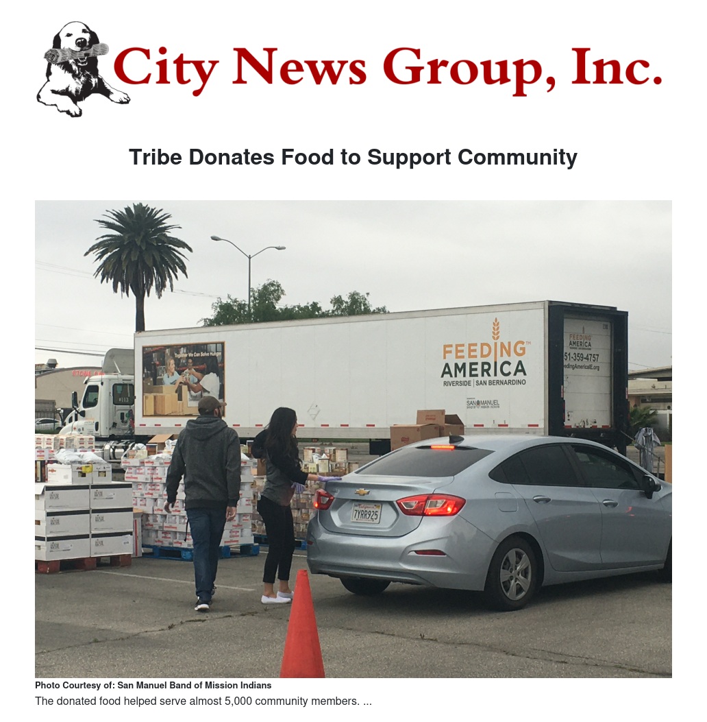 San Manuel Band of Mission Indians recently donated more than 40,000 pounds of food and supplies to Feeding America Riverside|San Bernardino (FARSB). On Saturday, April 4, FARSB hosted a drive-through distribution event at San Manuel Stadium in San Bernardino where approximately 1,100 cars came through (representing more than 5,000 members of the community) and were given staple items like rice, beans, and orange juice.
