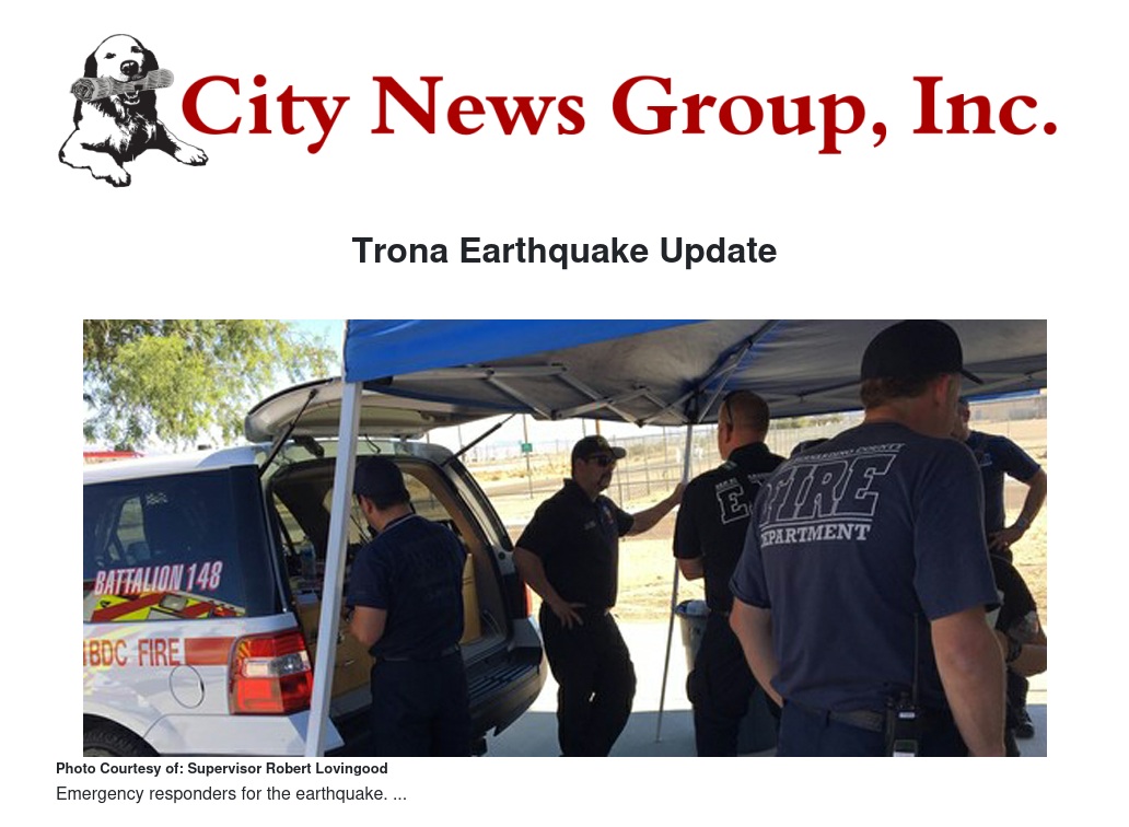 • The San Bernardino County Fire, Office of the Fire Marshal is continuing to conduct damage assessment in the Trona Area. FEMA officials will be conducting damage assessments to determine overall needs. This initial assessment will not include meetings with individual property owners.