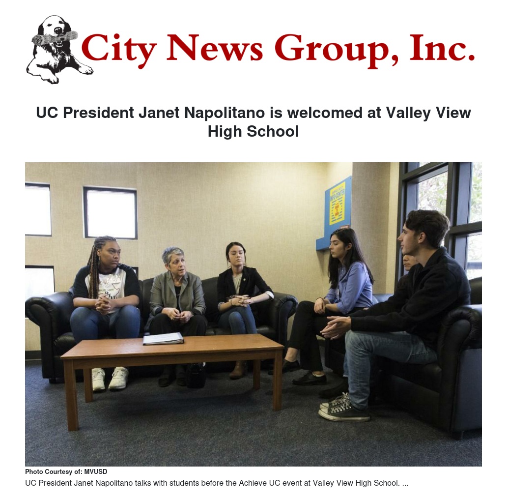 Students from Valley View High School had the unique opportunity to welcome the President of the University of California, Janet Napolitano, to an “Achieve UC” event on Thursday.