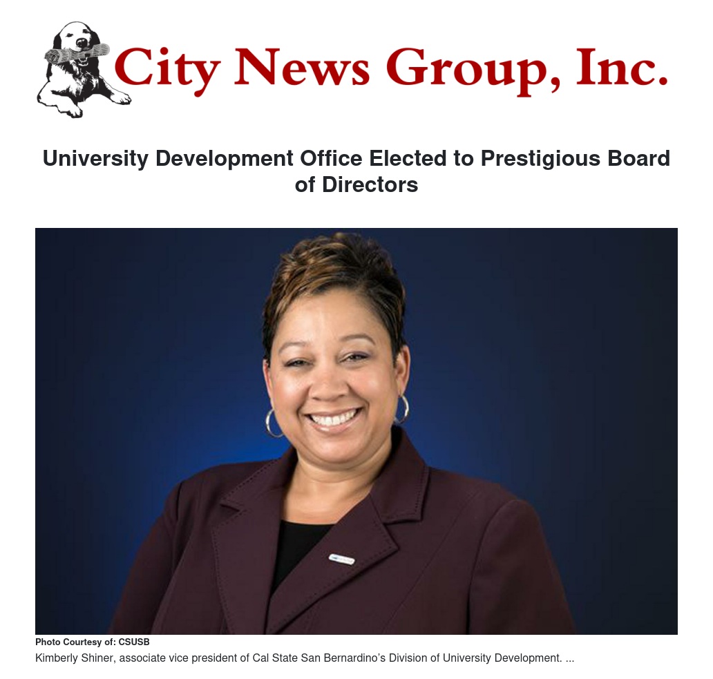 Kimberly Shiner, associate vice president of Cal State San Bernardino’s Division of University Development, has been elected to the Leadership California Board of Directors for a three-year term starting Jan. 1. This prestigious board has responsibilities to govern, set policy and direction, and lead the organization, while advancing toward its vision of “Moving Women from Success to Significance.”