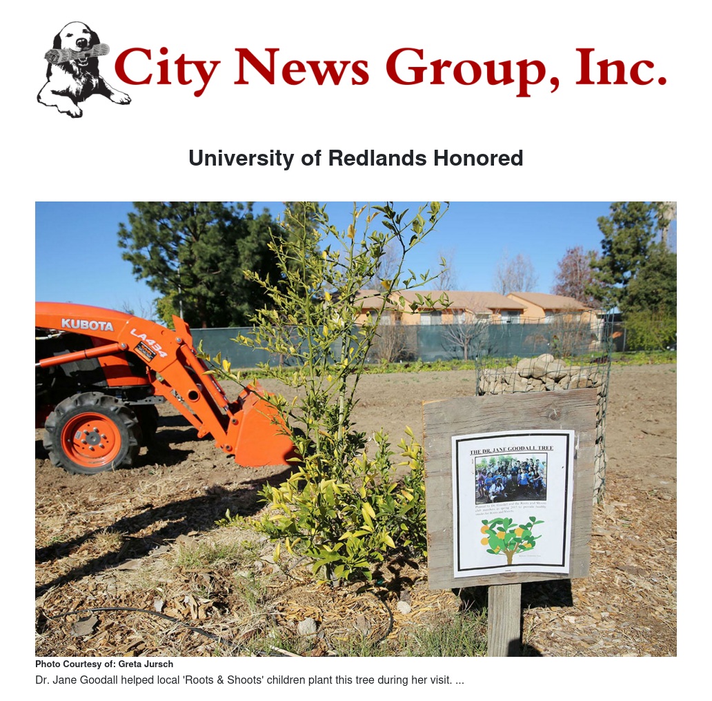To mark this year’s Arbor Day and celebrate the Tree Campus USA recognition, students from nearby Franklin Elementary School joined members of the U of R’s chapter of Dr. Jane Goodall’s “Roots and Shoots” and U of R Community Service Learning staff and students for a planting in the Sustainable University of Redlands Farm (SURF). Three companion trees were planted near the Jane Goodall tree—which Dr. Goodall herself helped to plant during her visit here in 2016—to create a small dwarf citrus garden.