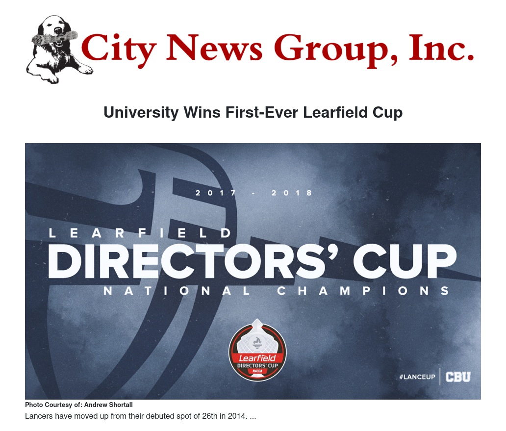 CBU will be honored for its victory at the 2018 National Association of Collegiate Directors of Athletics (NACDA) Convention during the Learfield Directors' Cup Awards Luncheon on Saturday, June 30th. The Lancers will begin their transition to Division I and the Western Athletic Conference in 2018-19.