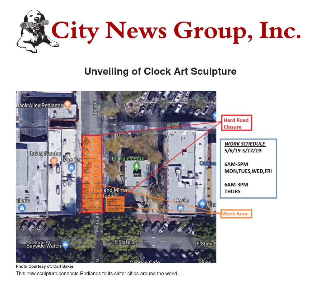 The City of Redlands will hold an unveiling ceremony for the Sister Cities Clock Sculpture, the City’s newest public art installation, at 6 p.m. Monday, May 20, at Ed Hales Park, at the corner of Fifth and East State streets.