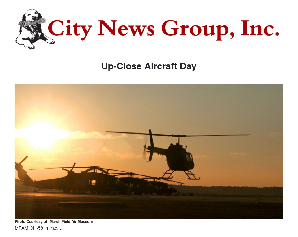 Each “Up-Close Aircraft Days” opportunity will be available from 11 a.m. to 3 p.m. on the scheduled date (Museum hours are 10 a.m. to 5 p.m.), and is included with regular Museum admission: $10 for guests ages 12 years and older; $5 for children ages 5 to 11 years; and free for ages 4 and younger. In case of inclement weather, other aircraft may be substituted. March Field Air Museum is a top-rated TripAdvisor attraction located alongside Interstate Highway 215 at Van Buren Boulevard, just south of downtown Riverside and adjacent to March Air Reserve Base.