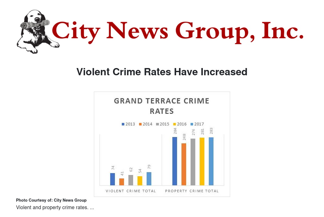 Since 2013, Grand Terrace has had an increase in several violent and property crime categories such as, robbery, aggravated assault, simple assault, burglary and larceny, according to the SBCSD Annual Report.