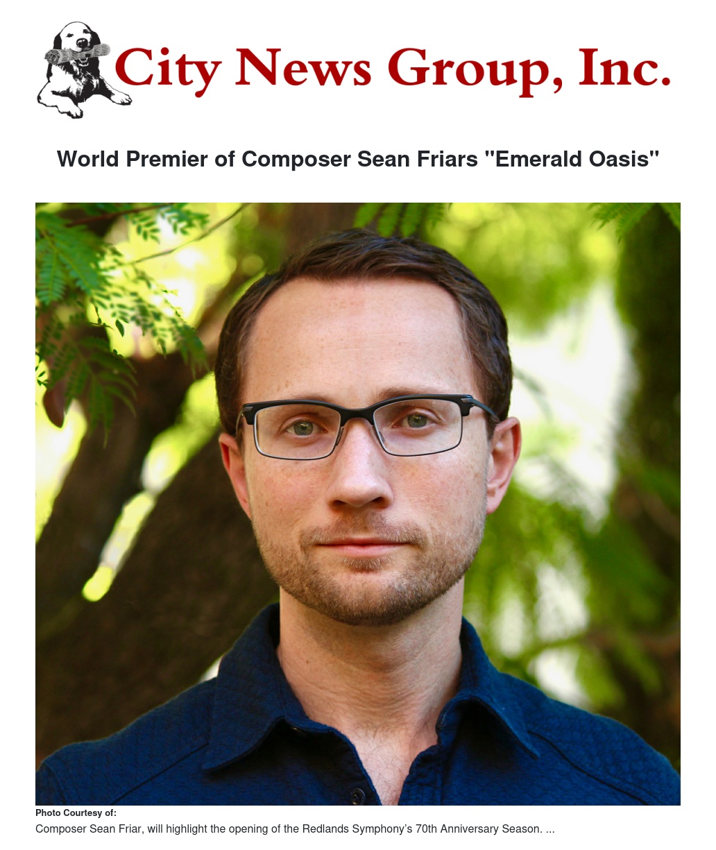 The Redlands Symphony opens its 70th Anniversary Season on Saturday, November 16, 2019 with the world premiere of Sean Friar’s Emerald Oasis, a fanfare, commissioned by the Symphony and inspired by the composer’s impressions of Redlands, California. The Symphony performs in Memorial Chapel on the campus of the University of Redlands. Doors open at 7 PM and the concert begins at 8 PM. There is a pre-concert talk that begins at 7:15 PM.